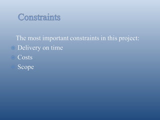 The document outlines a project to remotely monitor and control a home using sensors, cameras and other devices. A team of 6 students will work on the project, with roles including a team leader, analyst, developers and testers. The project will involve analyzing requirements, developing the software, testing, documenting and deploying the final product. OpenProj project management software will be used to organize tasks for team members and help ensure the project's successful completion.