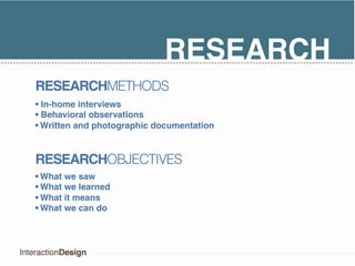 1) The document describes research conducted through home interviews, observations, and documentation to understand energy usage behaviors. It then profiles different generations including Boomers, Gen-Xers, and Gen-Yers through personas with attributes around energy attentiveness.