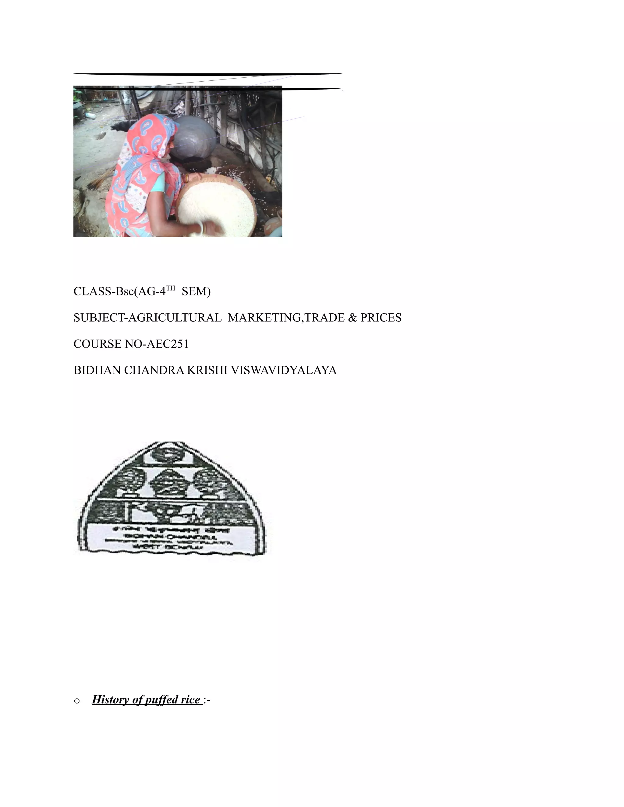 This document provides information on the history, production process, nutritional aspects, and recipes involving puffed rice. It discusses how puffed rice production has traditionally been a family business in some Indian villages. The production process involves soaking, drying, and heating rice in an iron pan to puff it. Puffed rice is a low-calorie snack that provides various vitamins and minerals. Popular Indian snacks like bhel puri and jhalmuri incorporate puffed rice. The document also includes a financial analysis of a puffed rice production unit, finding the unit to be financially viable with a output-input ratio greater than 1.