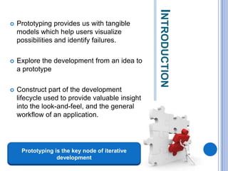This document discusses the design and prototype 1 of a home automation system called Home-Mess. It introduces prototyping and its benefits, including allowing users to visualize possibilities and identify failures. The objectives are defined as identifying user requirements, developing a supportive design solution, and designing a low-fidelity prototype. User requirements and a two-level prototyping approach are described. The presentation concludes by outlining next steps of evaluation, data analysis, user testing, and new designs.