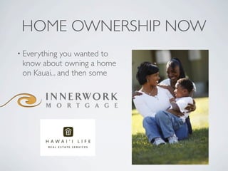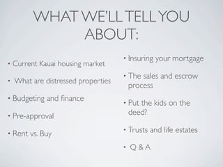 This document serves as a comprehensive guide for prospective homeowners in Kauai, covering topics such as the mortgage insurance process, housing market trends, and the homebuying procedure. It outlines the necessary steps to purchase a property, including team formation, financing options, and navigating escrow, while also emphasizing the importance of pre-approval and budgeting. Additionally, it discusses various real estate options, including distressed properties and legal considerations regarding property deeds for estate planning.