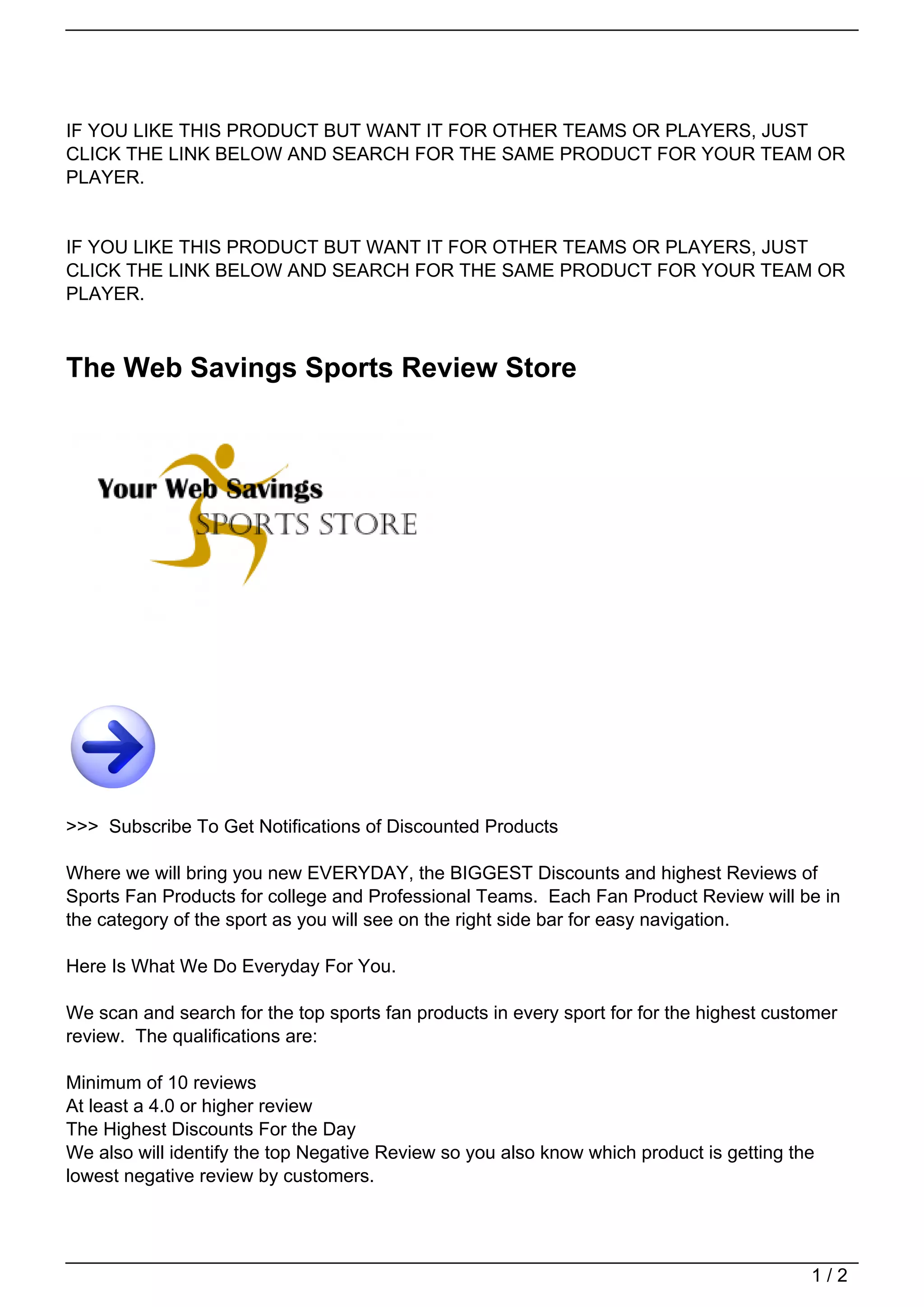 This document advertises a sports fan product review website that scans for the highest rated sports fan products daily in different sports categories. It provides discounts of 50% or higher on products with a review score of 4 stars or more. The website features the top 3 rated NBA products for the day with over 60% discounts. It also lists the lowest rated products. Users can click on reviews to read more or purchase products matched to their favorite teams.