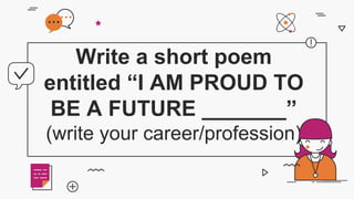 This document provides guidance to students on choosing a career and outlines steps to create a personal plan. It instructs students to write a short poem about their future career/profession. It then provides a sample poem about becoming a doctor. The document states that career choice reflects the roles one will take to contribute to society and the economy. Students are asked to create a personal plan in their notebook on achieving their career goal, including what they want to do for family, how to respond to societal needs, and how to contribute to the global economy. The document emphasizes that choosing a career involves careful planning and consideration for oneself as well as family and society.