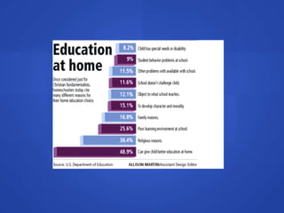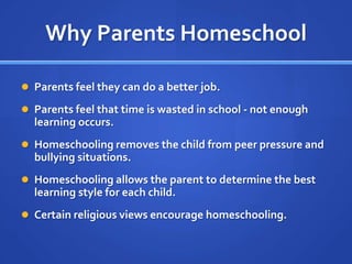 Two million American children are homeschooled. Parents choose homeschooling for various reasons such as feeling they can better educate their children themselves or to remove children from peer pressure. Interviews with two mothers who homeschool reveal pros like individualized attention but also potential cons like less socialization. Research shows homeschooled children perform equal or better academically and socially compared to traditionally schooled children. Long term effects can be positive if children have opportunities for socialization through extracurricular activities.