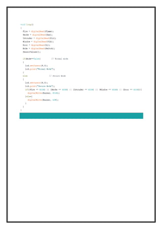 This document describes the design of a home security system that uses various sensors to detect intruders, fires, and gas leaks. The system has two modes - Secure mode, which monitors intruder detection, windows, and doors, and Normal mode which only monitors for fires and gas. An Arduino board controls sensors like PIR, vibration, infrared, flame, and gas sensors. When a threat is detected, the system sounds an alarm. The design aims to provide affordable home security using a microcontroller-based system.