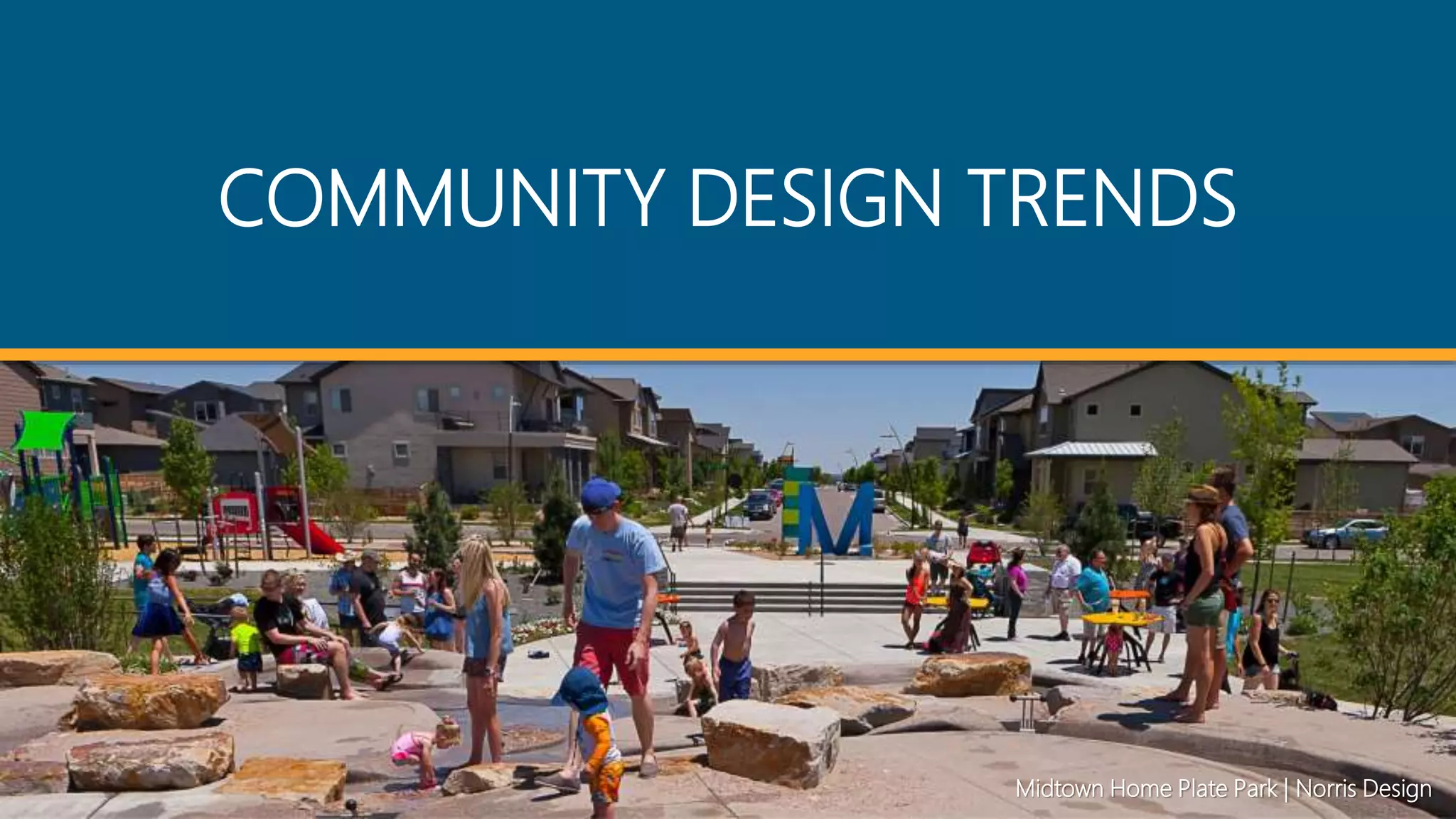 The document discusses current community design trends and challenges. It notes that construction and land costs are rising, sites are becoming more difficult to find, and how people live is changing. It also outlines major changes in demands, including a need for community inclusivity, building community connections, walkable neighborhoods that de-emphasize cars, accommodating more work-from-home arrangements, and amenity/clubhouse designs that focus on outdoor space, fitness, wellness and co-working. Current projects from Norris Design addressing these trends are also highlighted.