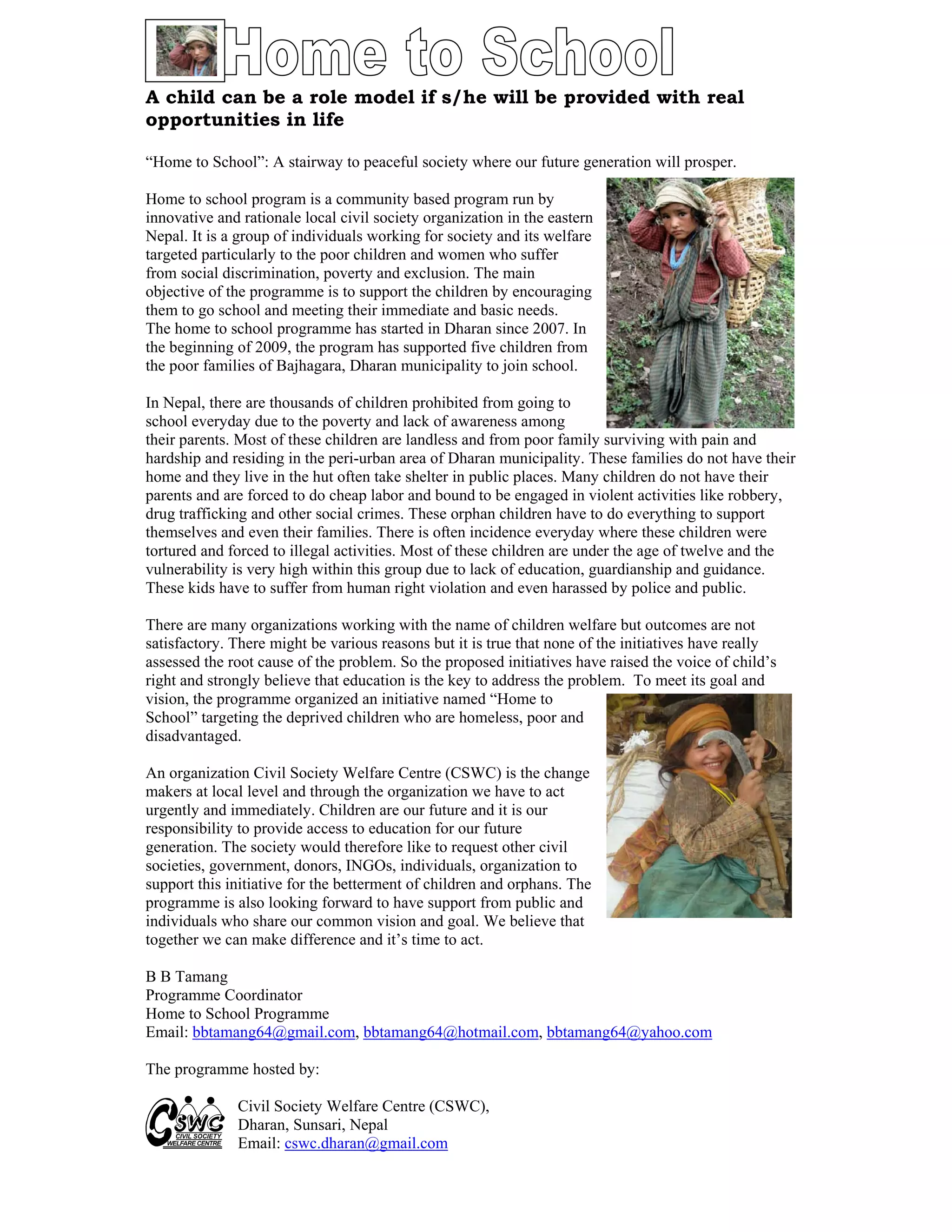 The Home to School program is a community-based initiative run by the Civil Society Welfare Centre in eastern Nepal that supports underprivileged children's access to education. It began in 2007 by helping 5 children from poor families in Dharan attend school. There are thousands of children in Nepal who cannot go to school due to poverty and lack of parental awareness. Many are homeless, orphaned, or forced into child labor. The program aims to meet these children's basic needs so they can pursue an education, with the goal of building a more just and prosperous society. It requests support from the government, organizations, and public to help more disadvantaged children.