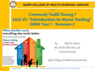 This document discusses home visiting in community health nursing. It defines home visiting as visiting families in their homes to assess health needs and provide services. The document outlines the objectives, principles, purposes and advantages of home visiting. It describes the steps of home visiting as fact finding, data analysis, planning, action/health education, follow through and evaluation. The principles of home visiting include having clear objectives and priorities and building relationships. The purposes are to assess needs, provide care and education to improve health. Advantages include reaching more families and gaining understanding of their lives.