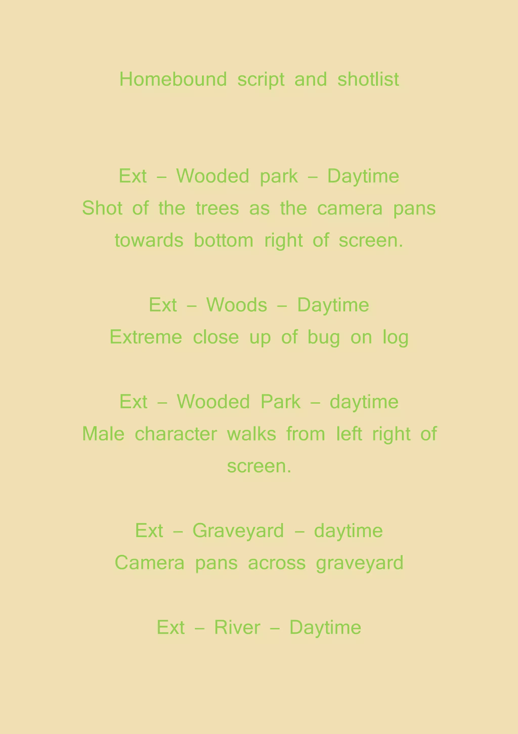 This document provides a shotlist and script for a film with scenes taking place in various outdoor and indoor locations. It involves a male protagonist who is a drifter reflecting on how society collapsed, with shots of the natural environment, infrastructure, and characters. The shotlist details camera placements and movements to capture things like a bug on a log, trees and the sun in the sky, a smashed interior, shaking hands, and a character walking through woods. It aims to portray the journey of a character in a post-apocalyptic setting through visuals of the changing world.