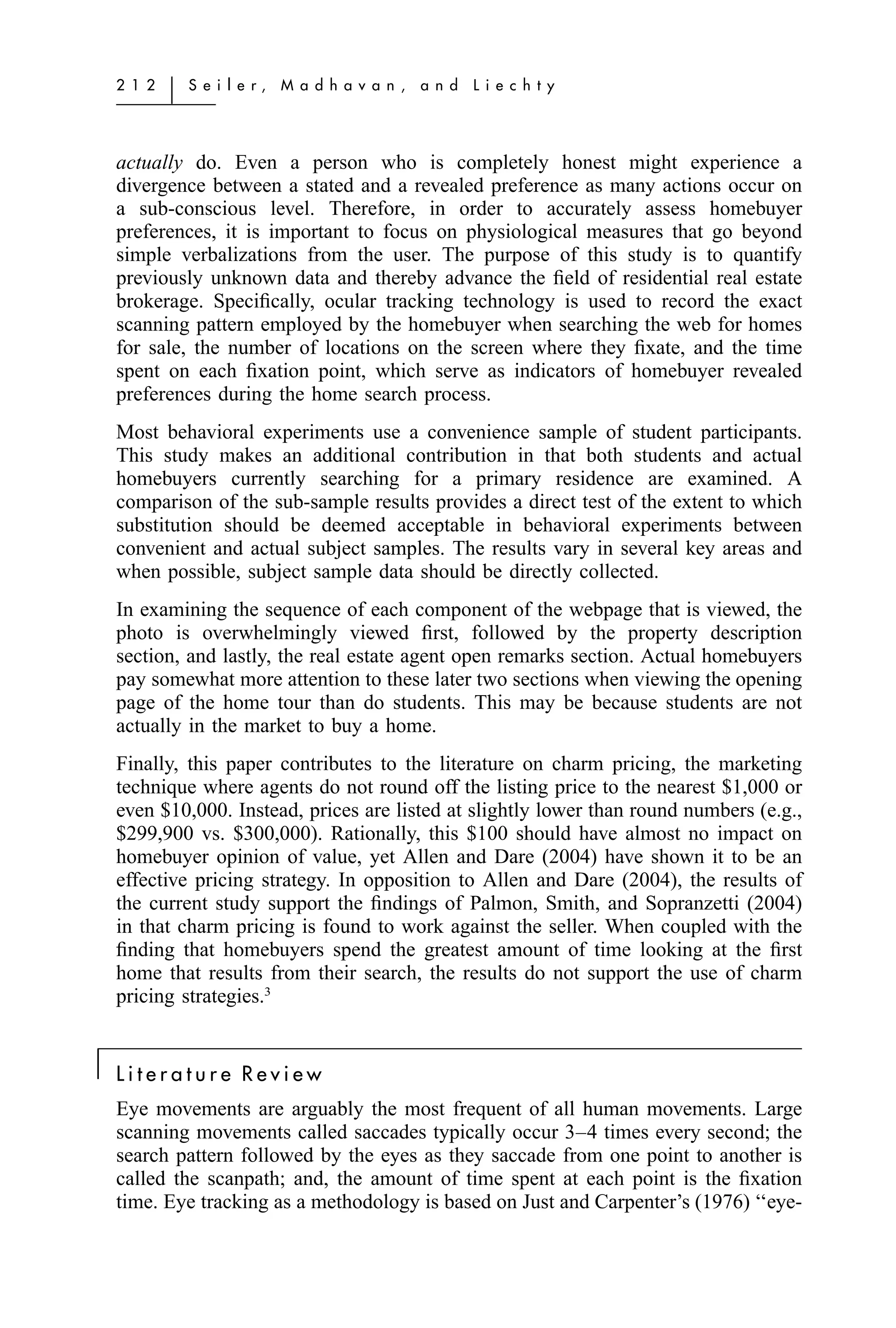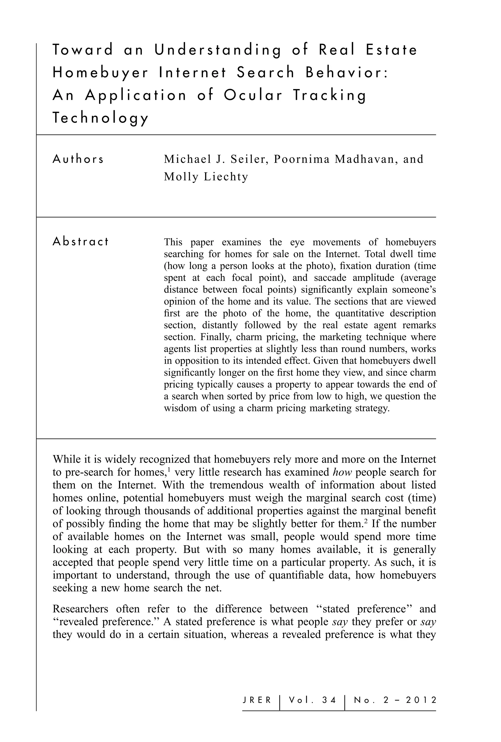 This paper analyzes the eye movements of homebuyers using ocular tracking technology to better understand their online search behavior when looking for homes. Key findings reveal that homebuyers pay significant attention to photos and descriptions of properties, while charm pricing strategies, meant to appear more attractive, may work against sellers as they do not align with homebuyers' viewing patterns. The study highlights the importance of physiological measures over self-reported preferences to accurately capture homebuyer behavior and preferences in real estate.
