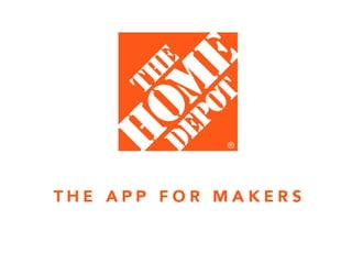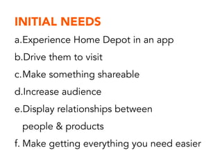 The document outlines the goals and challenges of redesigning the Home Depot app. It aims to inspire users to share projects, get organized, and make purchases. Research identified key user groups as makers, handymen, DIY-ers, and tech enthusiasts. The proposed solution combines social sharing aspects of Pinterest and Snap Guide with robust product search of Amazon. Wireframes and screenshots showcase the redesigned app interface. A business model includes promoted brands and rewards for users who post project guides and reviews.
