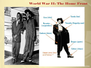 The document discusses how the US financed WWII, including raising over $321 billion through increased taxes, war bond sales, and growing the national debt. It describes the roles of war bonds, the Office of Price Administration, rationing of goods, victory gardens, and labor disputes. The war had large economic impacts like doubling GDP and tripling wages. It also discusses the internment of Japanese Americans, discrimination faced by minorities, key minority contributions like the Tuskegee Airmen and Navajo Code Talkers, and the election of FDR to a fourth term and his death in 1945.