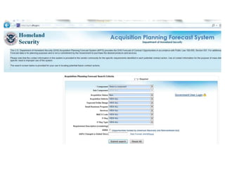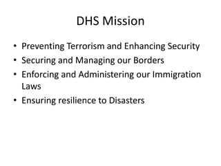 The document summarizes the Department of Homeland Security's real property programs and initiatives to improve sustainable management. It discusses DHS' mission areas and components that manage real property. Key initiatives include consolidation, co-location, flexible workplace strategies, disposition, energy and environmental programs, capital planning, and facility condition assessments. The document provides data on DHS' real property portfolio size, value, repair needs, and operating costs from 2008 to 2011. It also outlines drivers to improve federal real property management through various executive orders and GAO reports.
