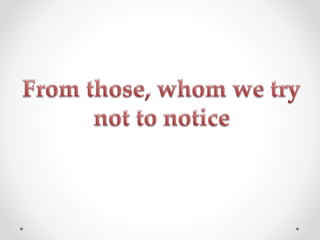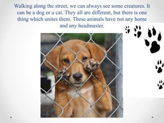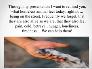 The document discusses the difficulties that homeless animals face living on the streets. It describes the physical hardships of hunger, cold, exhaustion, and lack of shelter that street animals experience. It also conveys the mental and emotional suffering of homeless animals, including fear, pain, loneliness, and loss of trust in humans. The document aims to make people aware that homeless animals have feelings and urges readers to help alleviate their suffering by providing care, food, shelter or adopting them.
