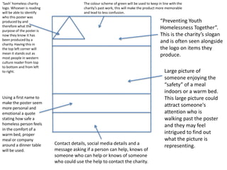 This document outlines the design of a poster for a homeless charity called Sash. It recommends including the charity's logo and name prominently to identify the organization. It also suggests featuring a large picture of someone enjoying indoor comforts and a quote from a homeless person to make the poster more personal and emotional. Contact information and a call to action are included at the bottom to encourage people to help or seek help from the charity. The document also discusses using green colors consistent with the charity's branding and a handwritten font to convey the message.
