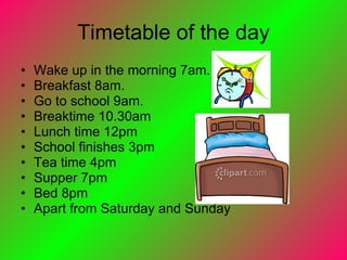 The document outlines a typical weekday schedule for a family including waking up at 7am, breakfast at 8am, school from 9am to 3pm, tea time at 4pm, and supper at 7pm with bedtime at 8pm. It also lists activities the family enjoys at home such as playing video games, watching TV, and playing outside. Favorite TV shows include Sponge Bob and The Simpsons, and favorite musicians are JLS, Bon Jovi, and One Direction. On weekends they enjoy outdoor activities like playing football, go kart riding, and horseback riding.