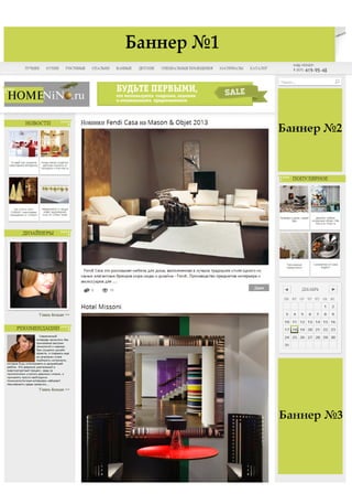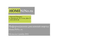 Документ представляет медиа-кит портала homenino.ru, который является региональным проектом по дизайну и стилю дома в Нижнем Новгороде. Портал предлагает полезную информацию для пользователей, включая советы по оформлению интерьера, а также объединяет производителей и потребителей. В документе также описаны возможности рекламного размещения и категории товаров, представленных на сайте.