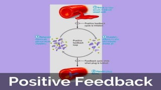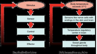 Homeostasis refers to the maintenance of a stable internal environment in the body. It involves negative feedback loops that counteract changes to keep properties like temperature and pH levels within normal ranges. The concept of homeostasis was introduced by Walter Cannon in 1930 and forms the basis of physiology. It works through a cyclical system of receptors that detect changes, a control center that activates effectors to correct deviations and restore balance. Most processes use negative feedback loops while some emergency responses employ positive feedback. Disruptions to homeostasis can cause illness.
