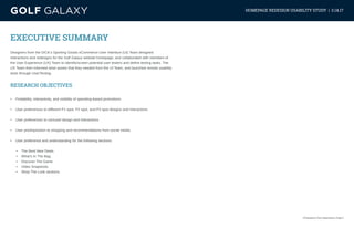 The homepage redesign usability study for Golf Galaxy involved 25 remote users to assess the effectiveness of various design features, including promotions, interaction expectations, and user engagement. Key findings indicated that while users generally found the interaction with free shipping promotions and product sections somewhat enjoyable, many did not feel that their expectations were met. Overall, the redesign aims to enhance user experience by improving findability, interactivity, and visibility of important sections on the website.
