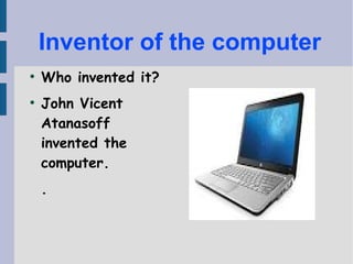 The document discusses computers, describing them as electronic machines that can be used to play games, access the internet, and listen to music. It notes that John Vicent Atanasoff invented the computer in 1942, and that computers are interesting because they allow users to do many things and are very comfortable to use.
