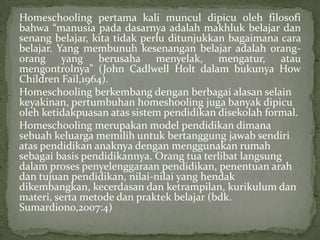 Homeschooling menjadi sebuah alternative yang layak untuk dipertimbangkan karena memberikan kemandirian belajar yang lebih besar bagi peserta didik, fleksibilitas waktu dan metode belajar, serta kesempatan sosialisasi yang lebih luas. Meskipun demikian, homeschooling juga berisiko mengurangi interaksi sosial dengan teman sebaya dari latar belakang beragam.