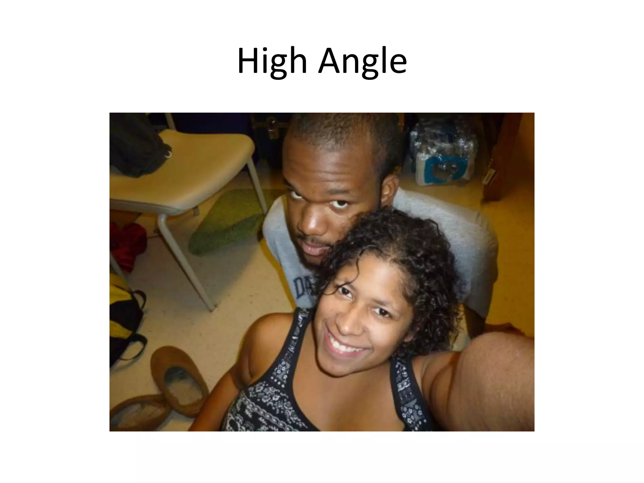 This document appears to be notes for a homework assignment in a journalism class, listing different camera shot types including high angle, medium shot, close up, low angle, and long shot.
