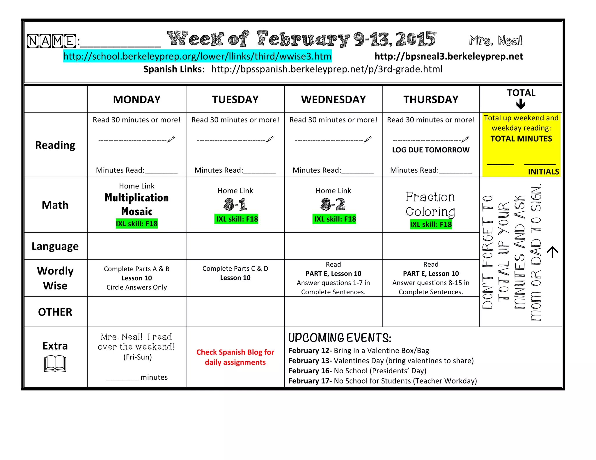 This document contains a student's weekly homework assignment schedule for the week of February 9-13, 2015. It includes assignments for reading, math, language, and Spanish. The student is expected to read for at least 30 minutes each weekday and log their total minutes read. Math assignments include multiplication, fractions, and IXL skills. Language assignments are from the Wordly Wise book. The student should check the Spanish blog for daily Spanish assignments. Upcoming events noted are bringing in a Valentine box/bag on February 12th and celebrating Valentine's Day on February 13th.