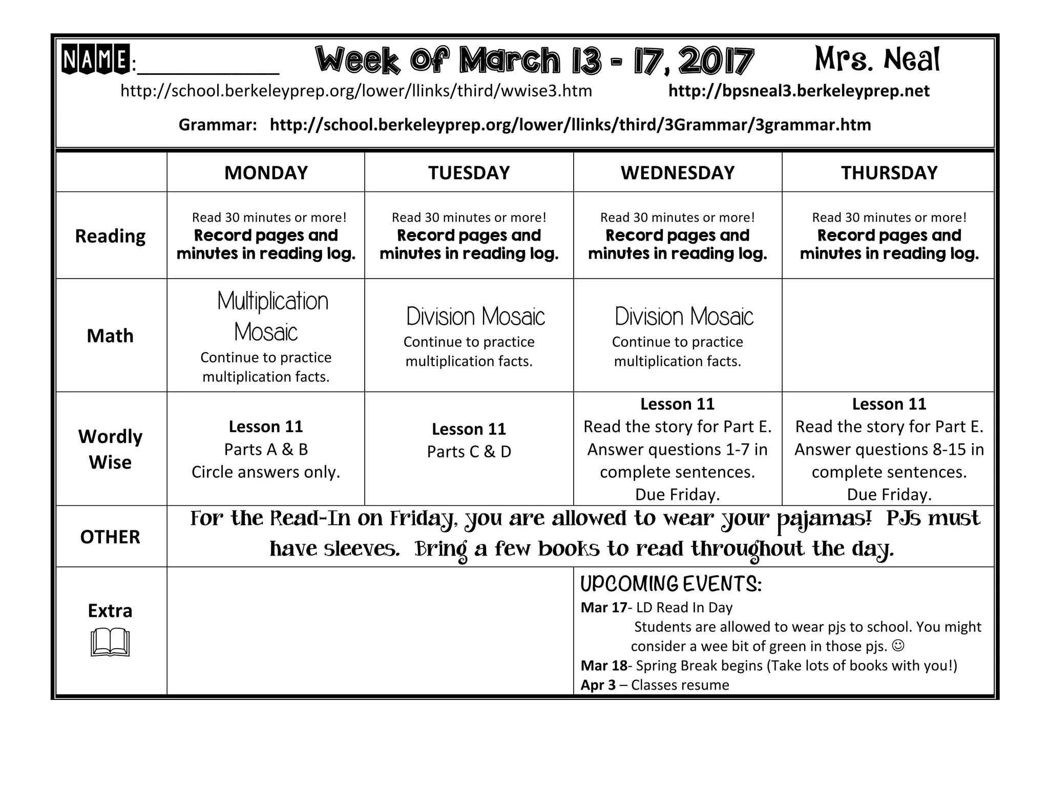 This document is a student's weekly homework schedule for the week of March 13-17, 2017. It includes assignments for reading, math, vocabulary, and upcoming events. The student is expected to read for 30 minutes each day and record it in a reading log. Math assignments include continuing to practice multiplication and beginning division mosaic lessons. Vocabulary lessons from Wordly Wise are also assigned. On Friday, there will be a Read-In day where students can wear pajamas to school while bringing books to read throughout the day. Upcoming events noted are the Read-In on March 17th and Spring Break beginning March 18th.