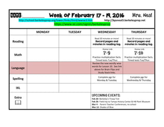 This document provides a weekly schedule for a third grade class taught by Mrs. Neal for the week of February 17-19, 2016. It includes assignments for each subject each day, including reading for 30 minutes and recording it in a log, practicing multiplication facts and taking timed tests on Tuesdays and Thursdays, reviewing vocabulary words, completing spelling pages, and optional extra practice on IXL. Upcoming events are also noted such as Berkeley's Troop Trot on February 20th and a field trip to local museums on February 26th.