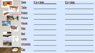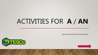 This document provides activities and examples for using articles "a" and "an" correctly with nouns. It includes examples of asking what something is and providing the answer with illustrations. It also has an activity to circle 10 words starting with vowels and write sentences using "a" or "an". The goal is to practice using articles correctly with nouns.