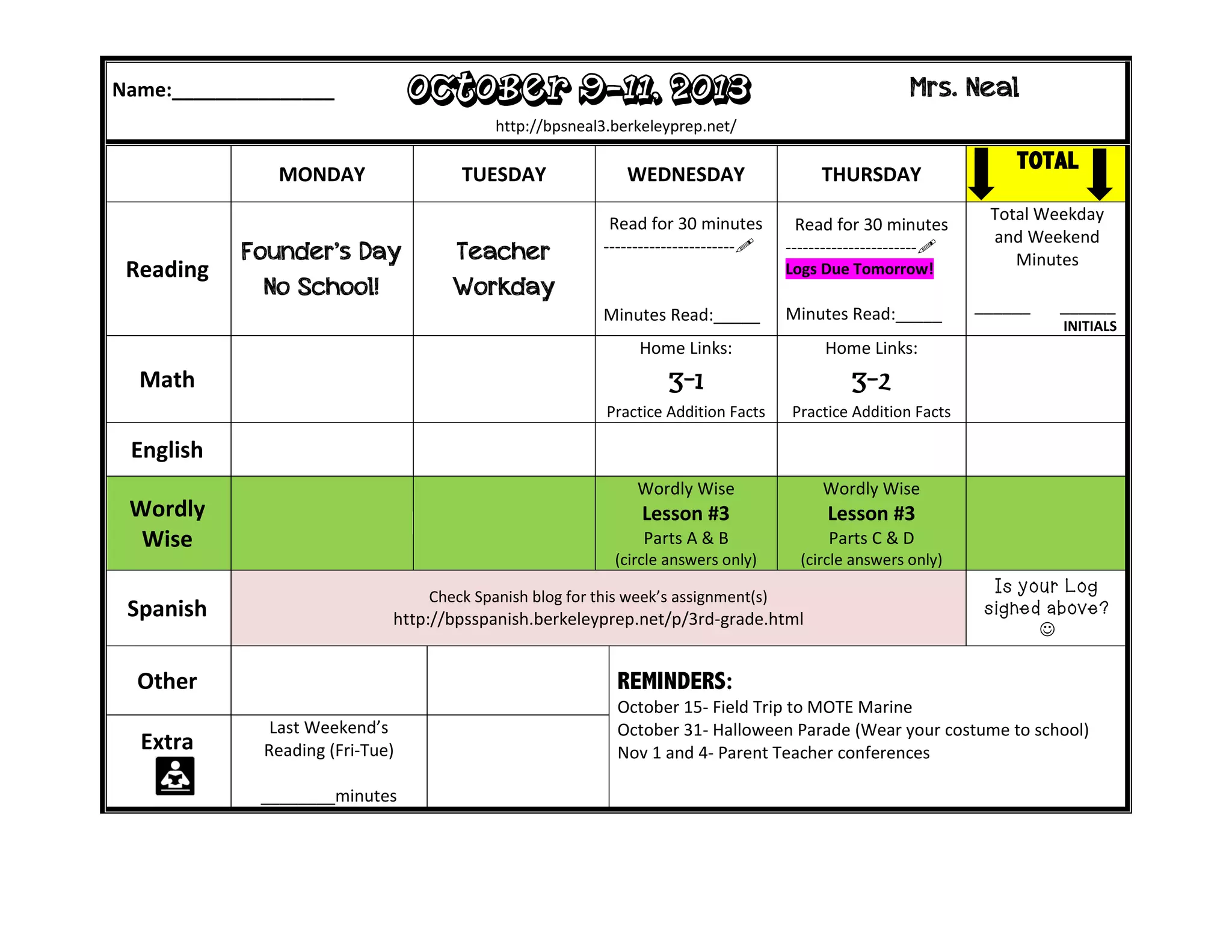 Name:_______________ October 9-11,2013 Mrs. Neal http://bpsneal3.berkeleyprep.net/ MONDAY TUESDAY WEDNESDAY THURSDAY TOTAL Reading Founder’s Day No School! Teacher Workday Read for 30 minutes ----------------------- Minutes Read:_____ Read for 30 minutes ----------------------- Logs Due Tomorrow! Minutes Read:_____ Total Weekday and Weekend Minutes ______ ______ INITIALS Math Home Links: 3-1 Practice Addition Facts Home Links: 3-2 Practice Addition Facts English Wordly Wise Wordly Wise Lesson #3 Parts A & B (circle answers only) Wordly Wise Lesson #3 Parts C & D (circle answers only) Spanish Check Spanish blog for this week’s assignment(s) http://bpsspanish.berkeleyprep.net/p/3rd-grade.html Is your Log signed above?  Other REMINDERS: October 15- Field Trip to MOTE Marine October 31- Halloween Parade (Wear your costume to school) Nov 1 and 4- Parent Teacher conferencesExtra Last Weekend’s Reading (Fri-Tue) ________minutes