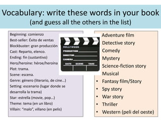 - Students are asked to write vocabulary words, answer questions about genres of films, complete grammar and workbook exercises, respond to listening comprehension questions, translate a paragraph, and read a passage answering comprehension questions.
