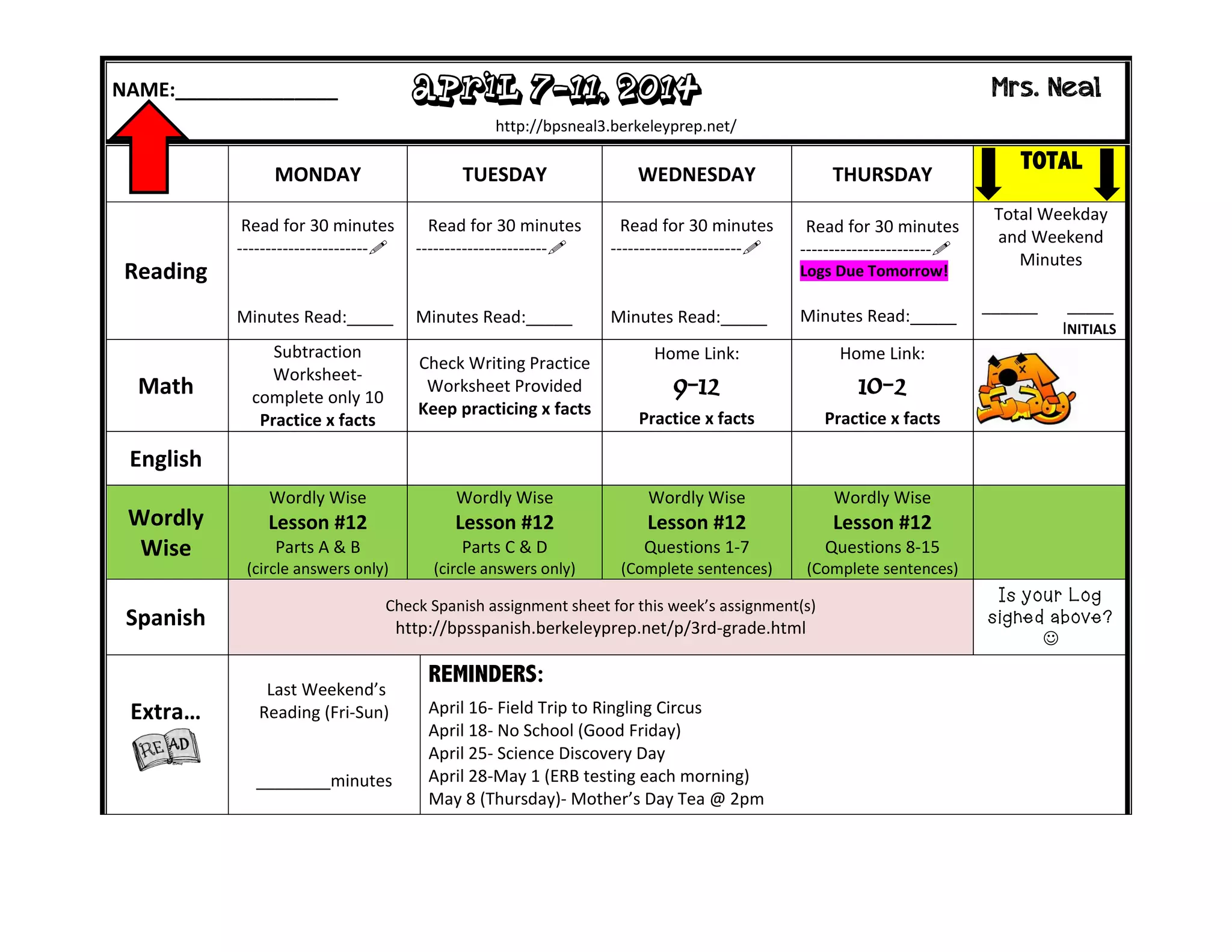 This document is a homework log and schedule for a student from April 7-11, 2014. It outlines the daily assignments for reading, math, English, and Spanish. It also provides reminders about upcoming events, including field trips, testing dates, and a Mother's Day tea. The student is asked to log their daily reading minutes and initial the log.