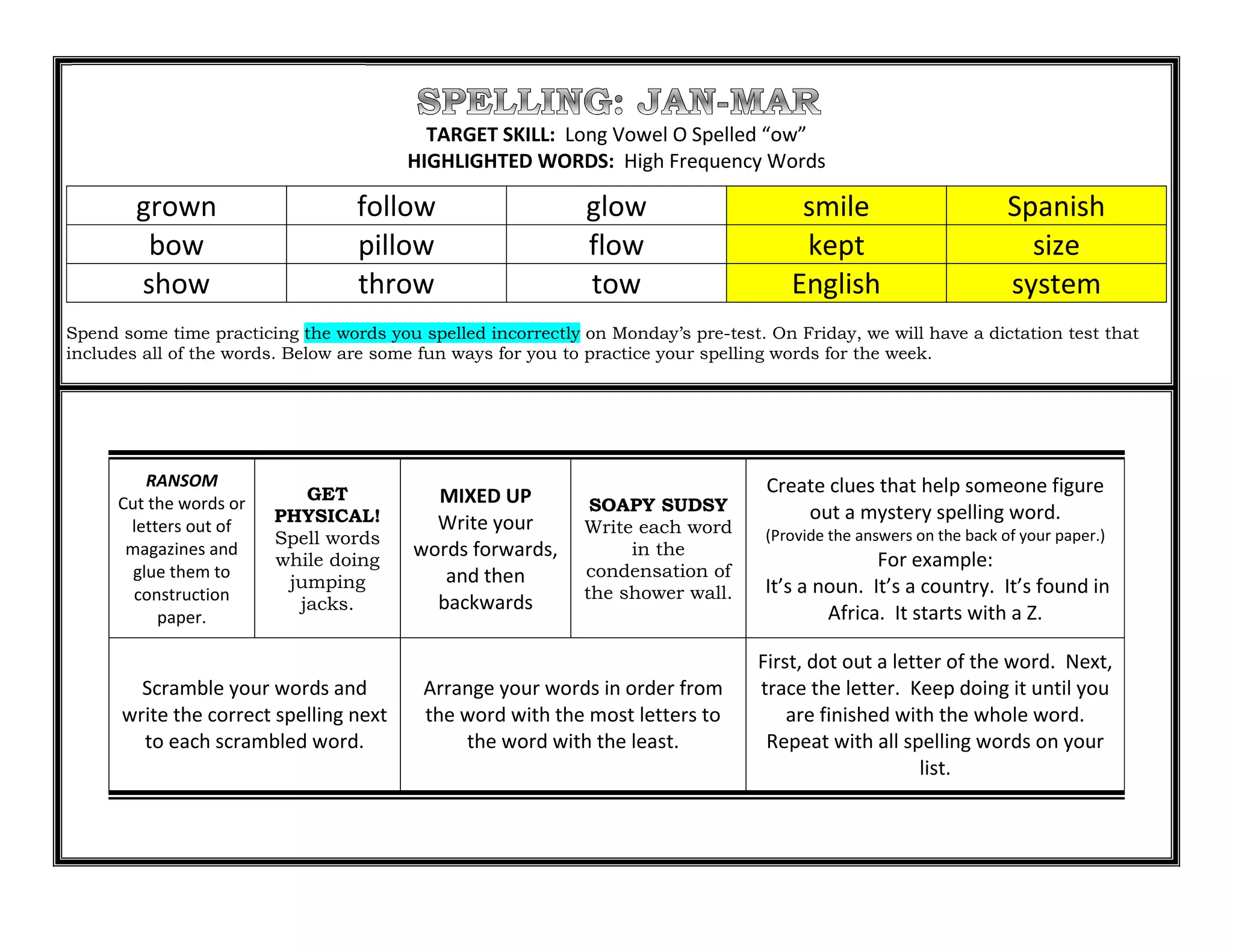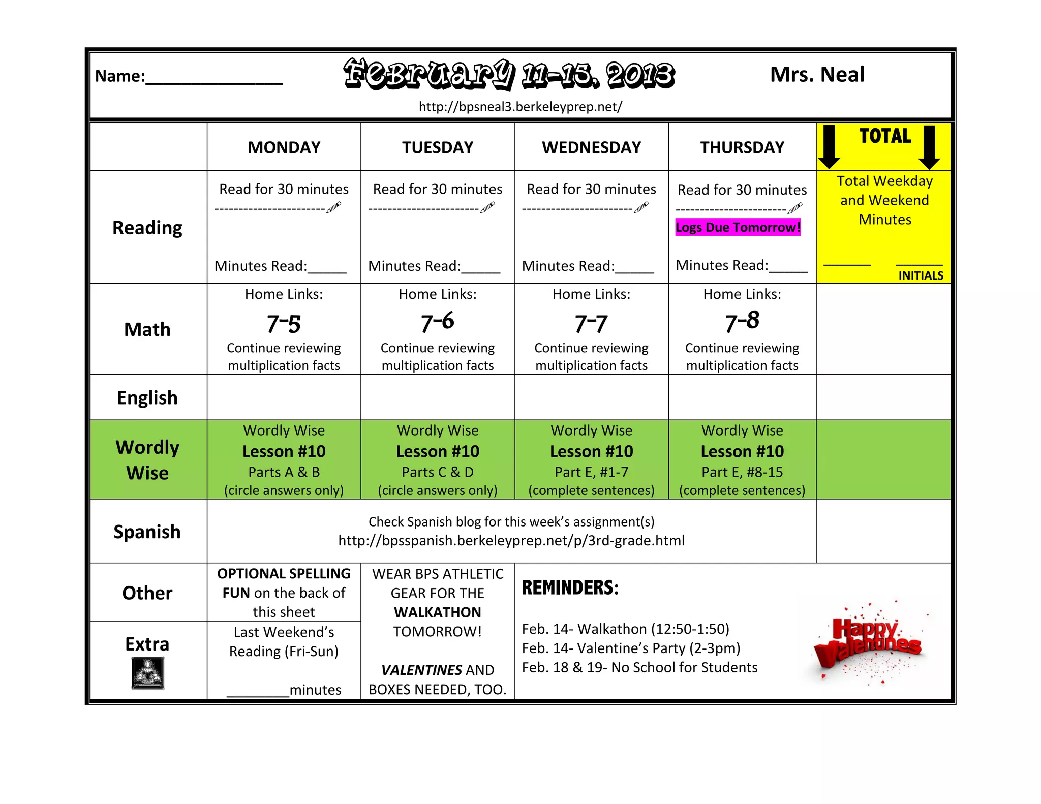 The document is a student's weekly homework and class schedule. It includes assignments for reading, math, English, Spanish, and spelling for each day of the week. It also lists reminders about upcoming events like a walkathon and Valentine's party. The student is asked to log their daily reading minutes and complete assignments from Wordly Wise lessons and optional spelling practice activities.