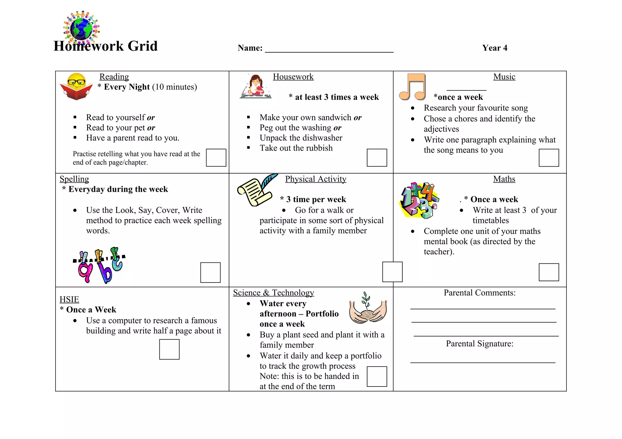 This document is a homework grid for a student listing weekly assignments in various subjects. It includes reading assignments to be done nightly, as well as weekly assignments in housework, music, spelling, physical activity, maths, science & technology, and HSIE. The student is expected to read for 10 minutes per night, do housework 3 times a week, research and write about a song once a week, practice spelling everyday, do physical activity 3 times a week, do math assignments once a week, do a science experiment once a week, research a building in HSIE once a week, and have their parent sign off and provide comments.