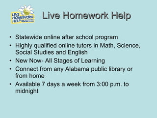 The document outlines a live homework help program available in Alabama, featuring online tutors in various subjects accessible from public libraries or home. The service operates daily from 3:00 p.m. to midnight with specialists like certified teachers and professors. Students can connect with tutors through a user-friendly online classroom, which includes tools like a whiteboard for interaction and a chat box for communication.