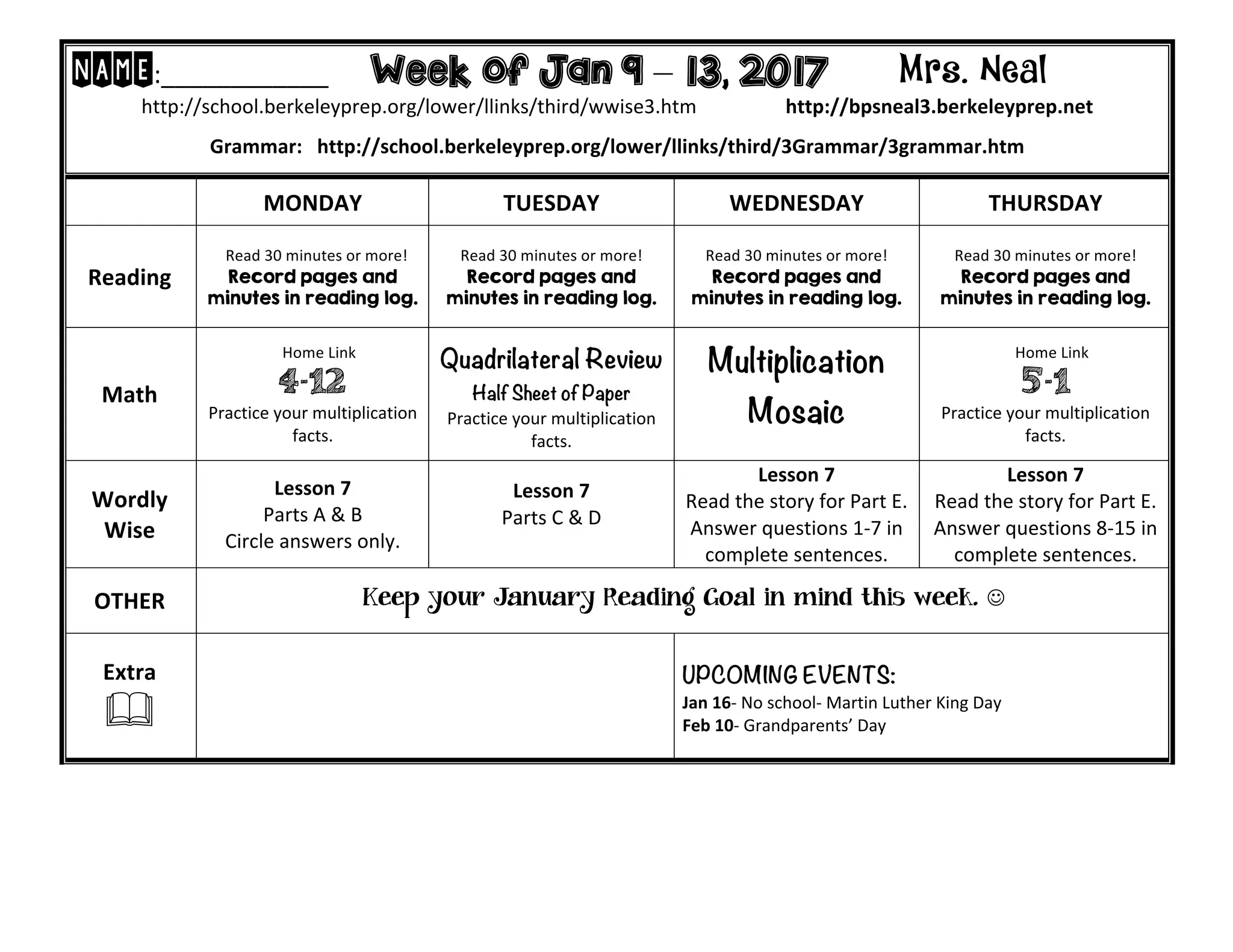 This document provides a weekly schedule for the week of January 9-13, 2017 for a third grade class taught by Mrs. Neal. It includes assignments for reading, math, grammar, and Wordly Wise lessons for each day. Students are instructed to read for at least 30 minutes each day and record it in their reading log. Math assignments include a home link on multiplication facts and lessons on quadrilaterals, multiplication mosaics, and other topics. Wordly Wise lessons 7A-B and 7C-D are assigned for different days. Keeping a January reading goal and upcoming holidays and events are also noted.