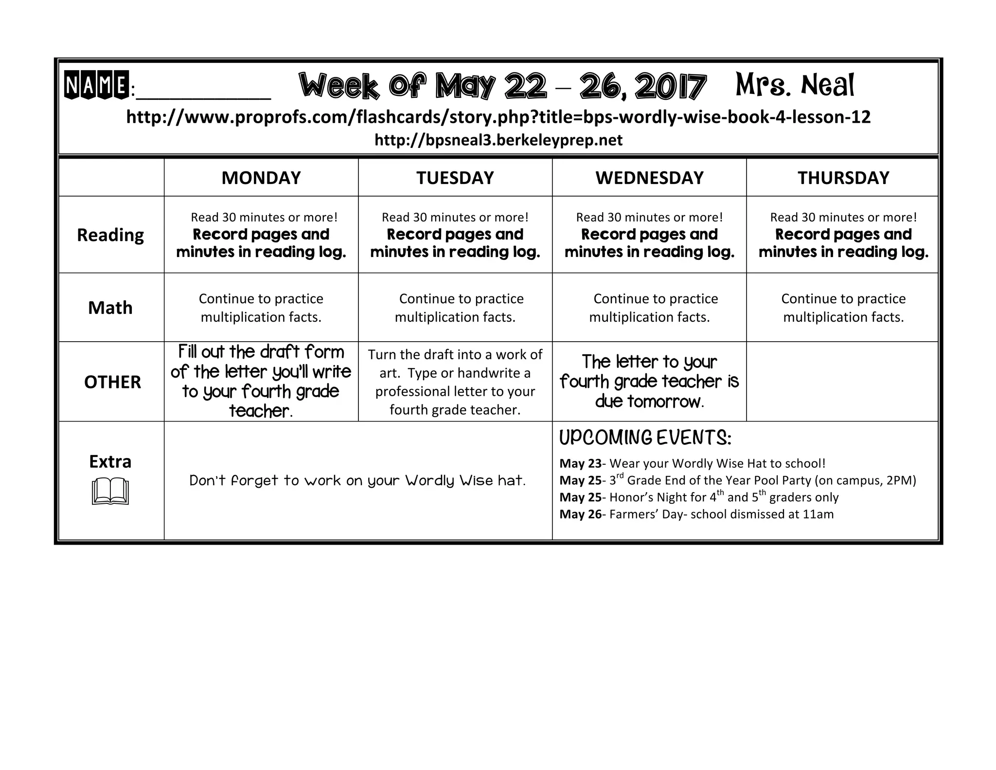 This document contains a student's weekly homework schedule for the week of May 22-26, 2017. It includes assignments for reading for 30 minutes each day and practicing multiplication facts. On Monday, the student is asked to draft a letter to their fourth grade teacher and on Tuesday to turn the draft into a work of art or to type or write the letter professionally. The letter is due on Wednesday. It also lists upcoming school events that week, including wearing a Wordly Wise hat to school on Tuesday and a third grade pool party and honors night event.