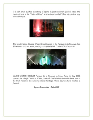 This homework discusses several amazing water parks and sources around the world in 3 paragraphs or less. The first paragraph discusses a water park in San Antonio that is fun for families with water slides, waves, and water sports. The second paragraph describes a smaller water park in Irvine, California called Wild Rivers that has extreme slides like a 72 foot free fall tube slide. The third paragraph discusses the Magic Water Circuit in Lima, Peru, which has 13 beautiful fountains and pools, making it one of the largest water sources in the world.