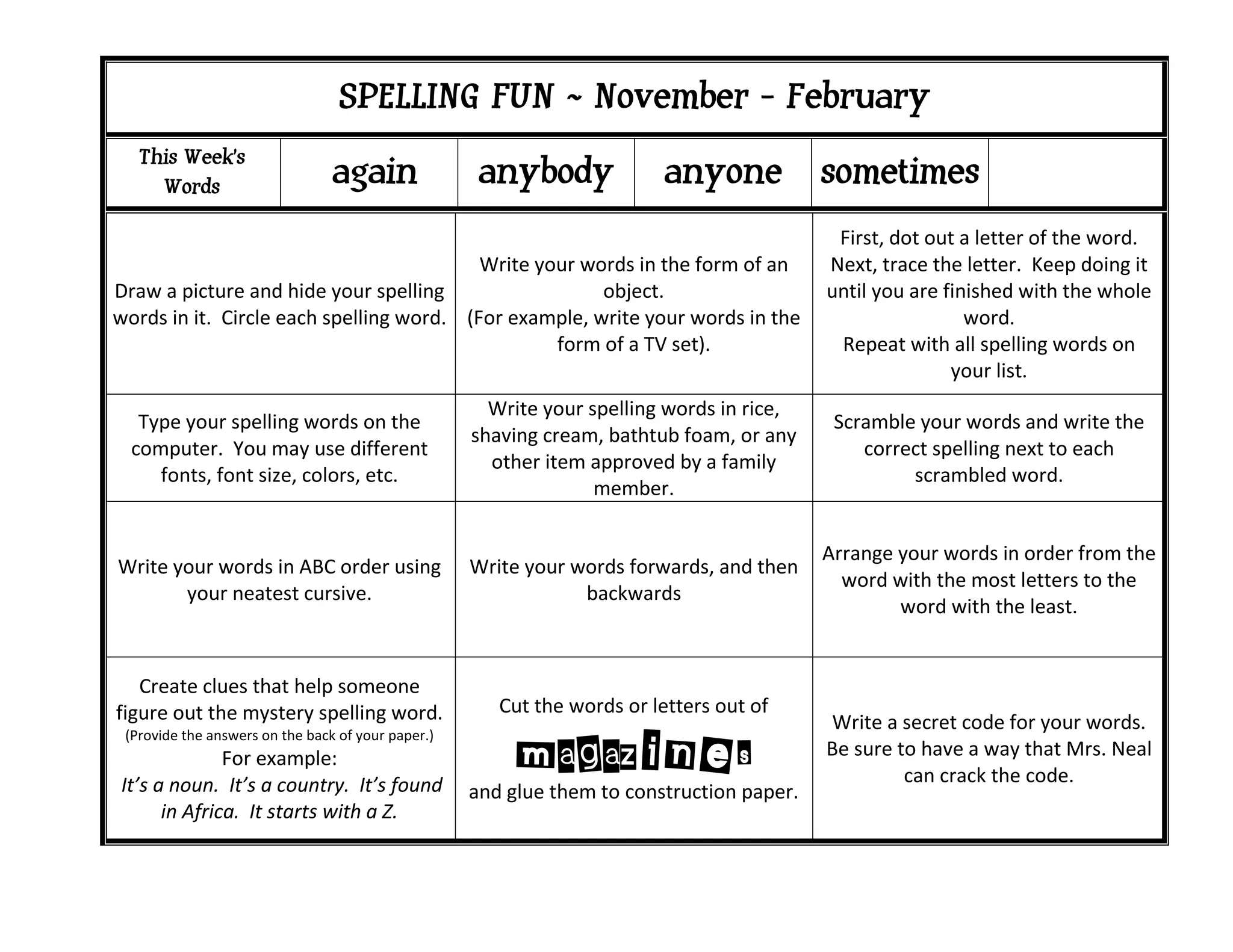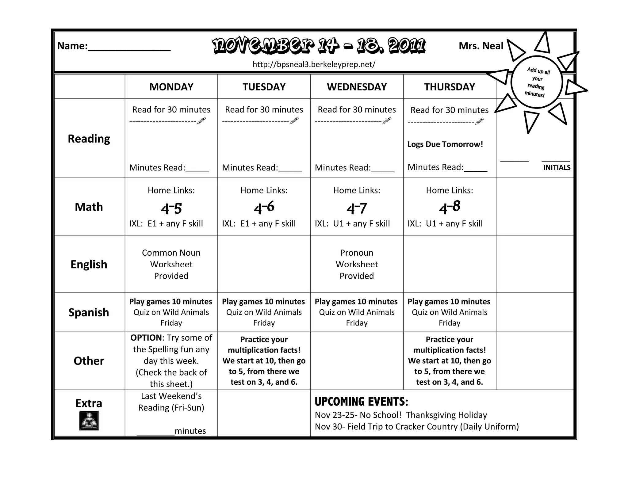 This document appears to be a weekly homework schedule and calendar for a student provided by their teacher, Mrs. Neal, for the week of November 14-18, 2011. It includes daily reading and math assignments, as well as assignments for other subjects such as English, Spanish, and optional spelling activities. Upcoming events are noted, including no school for Thanksgiving and a field trip at the end of the month.