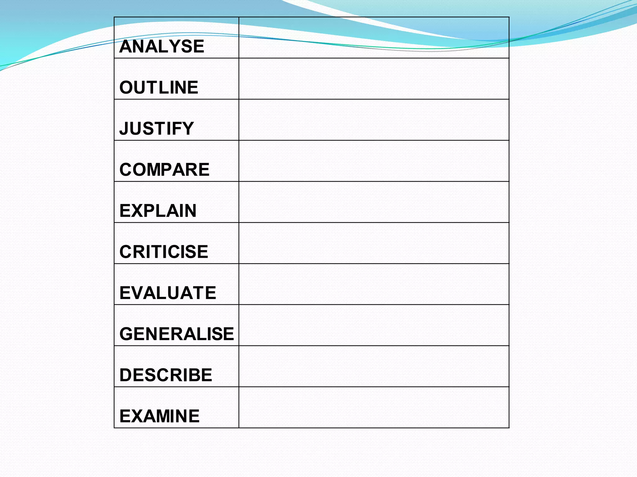 This document provides definitions for common instruction words used in assessments. It categorizes the words into three levels - those that demonstrate knowledge and understanding, those that use knowledge and understanding, and those that make a judgement based on evidence. Examples are provided for each word along with how they would be sorted into the three categories. The document also provides sample questions using the instruction words based on analyzing given articles and video clips.