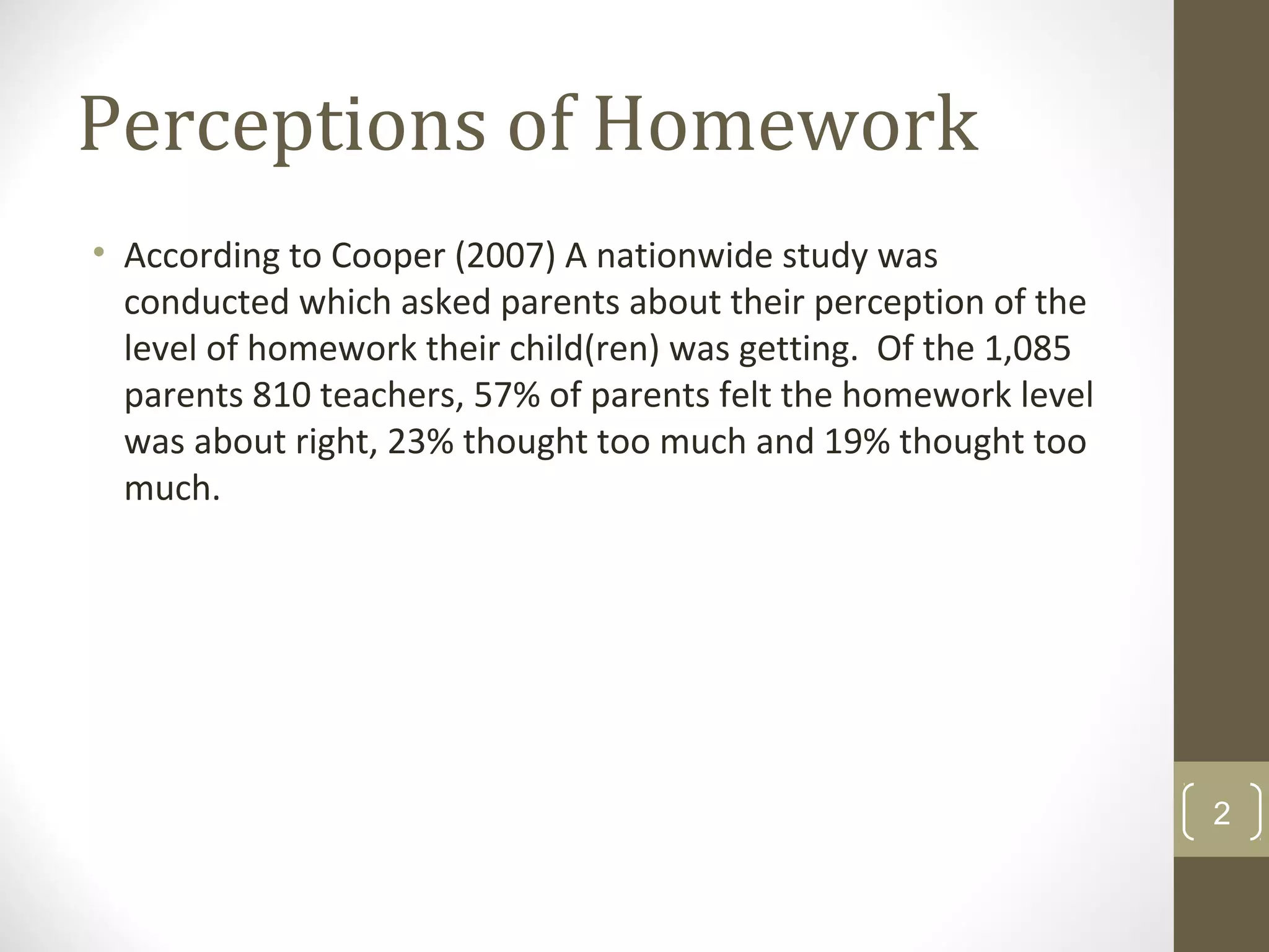 - A survey found that most parents and teachers felt the amount of homework was appropriate, though some felt there was too much or too little.