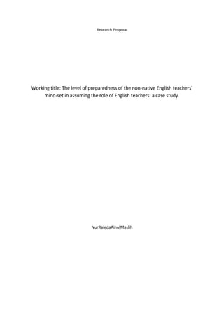 This research proposal examines the level of preparedness of non-native English teachers in Malaysia to teach English. It aims to identify teachers' levels of preparedness prior to teaching, determine factors influencing their sense of preparedness, and examine implications of inadequacies. Poor performance on the PISA exam raised questions about English instruction quality. The proposal cites the government's efforts to improve teachers' English proficiency and argues it is important to assess teachers' readiness to fulfill their role as English instructors. The research questions focus on teachers' levels and factors of preparedness, and implications of ill-prepared mindsets. The study may benefit students, parents, educators and the Malaysian government.