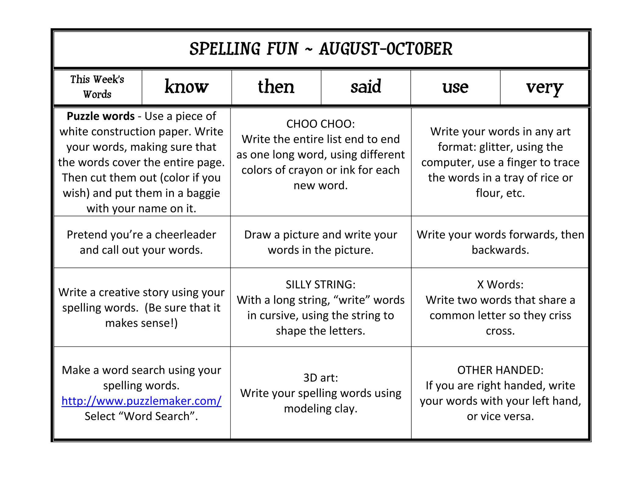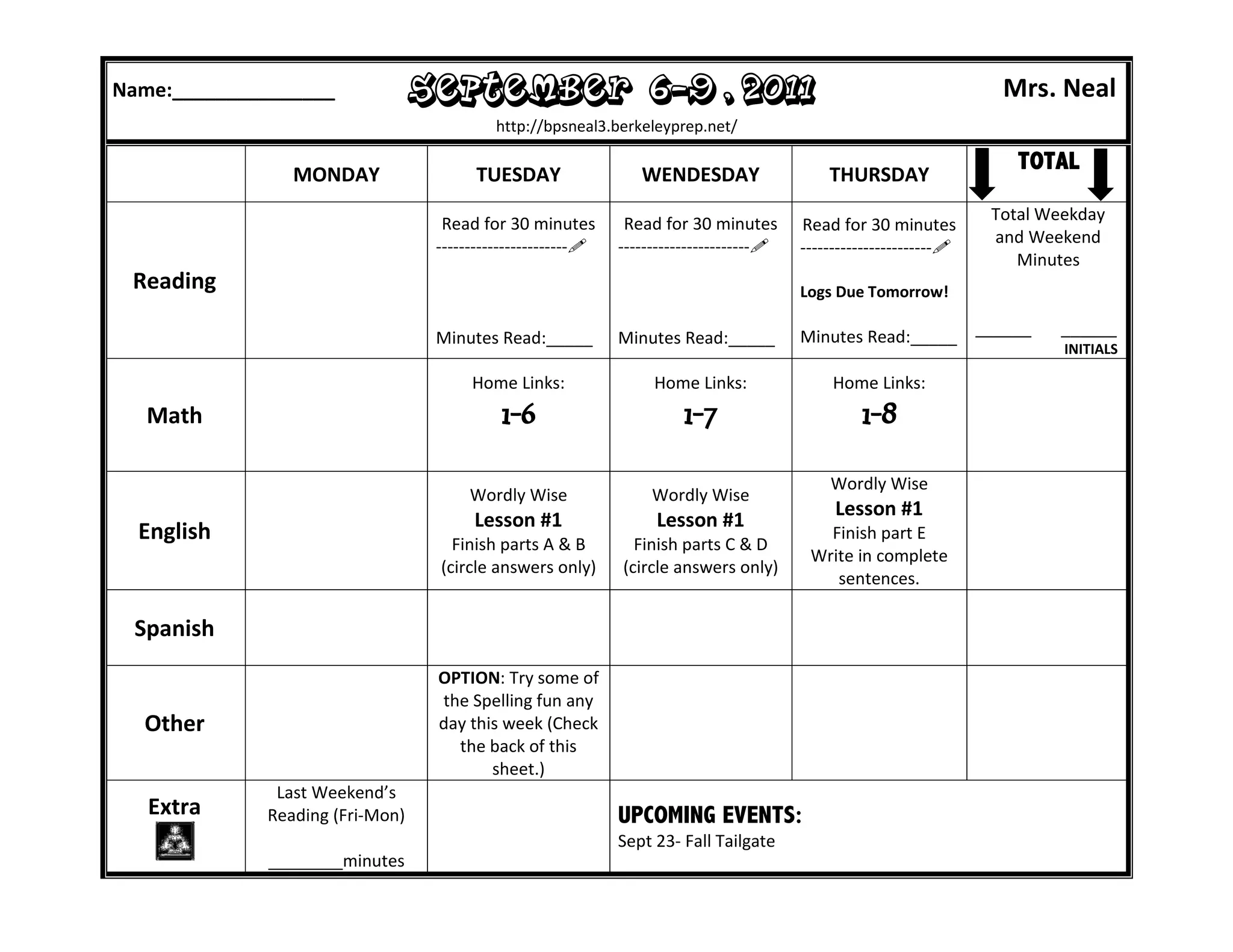 This document appears to be a reading and homework log for a student from September 6-9, 2011. It includes spaces to log daily reading minutes and assignments in reading, math, English, Spanish, and other subjects. There are also sections for logging weekend reading minutes and upcoming events. Suggested spelling activities for the week's words are listed at the bottom, such as writing the words in different art formats, as a cheer, story, word search, or using 3D modeling clay.