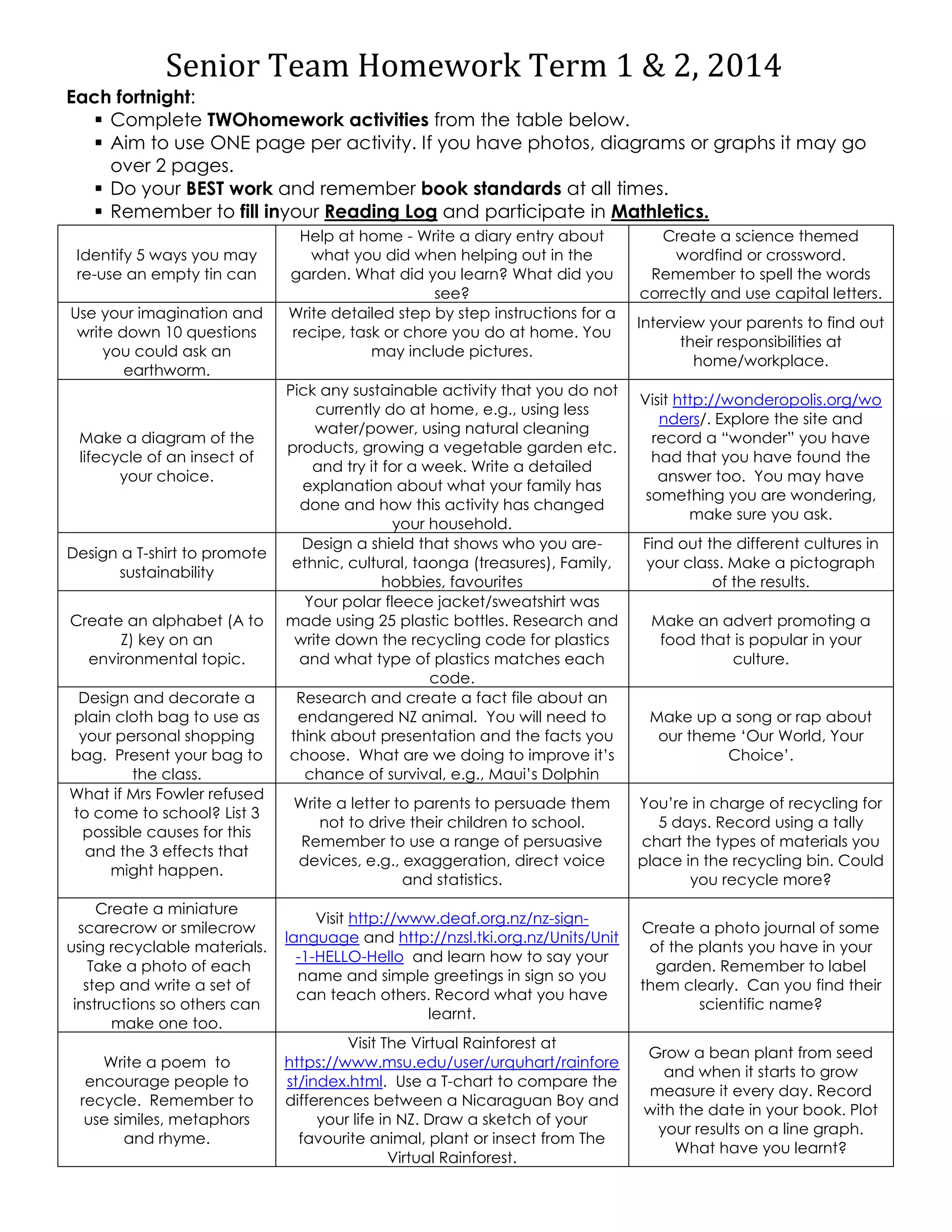 The document provides homework instructions for students over two fortnights. It instructs students to complete two homework activities from the provided table each fortnight. Students are asked to use one page per activity, unless additional pages are needed for photos, diagrams or graphs. They are reminded to do their best work and follow book standards. It also reminds students to fill in their reading logs and participate in Mathletics.