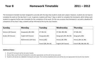 This document provides homework timetables for Years 7 through 11 that assign which subjects have homework set on each day of the week. It notes that students have 7 days to complete homework unless otherwise informed. For each year, it lists the subject and class that has homework assigned for each day, as well as some additional notes about art, ICT, drama, music, PE, and online maths homework.
