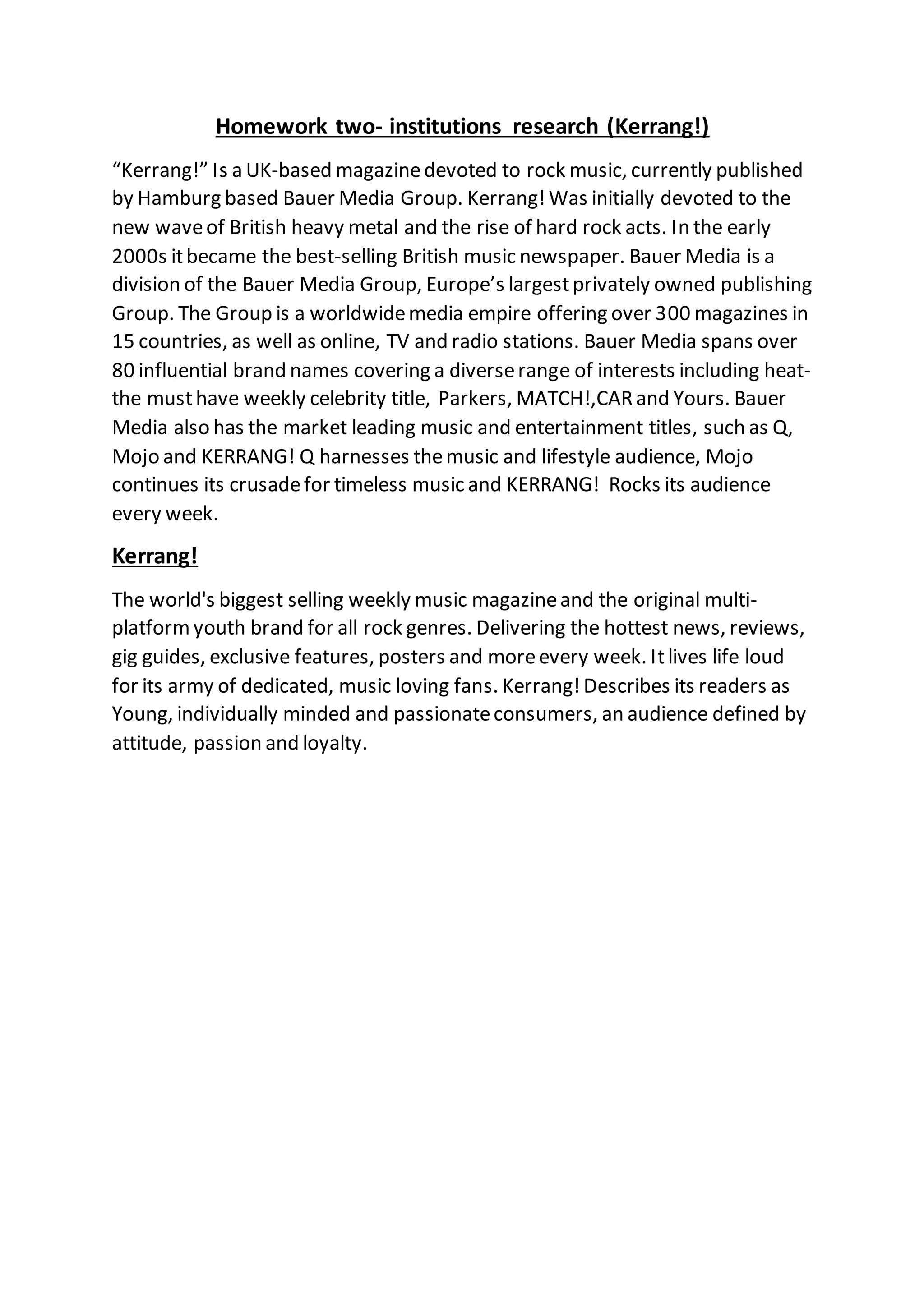 Kerrang! is a UK-based magazine devoted to rock music that is currently published by Bauer Media Group, a large European publishing company. Originally focused on British heavy metal, Kerrang! became the best-selling British music newspaper in the early 2000s. Bauer Media owns over 300 magazines across 15 countries and various media properties. As one of Bauer Media's music and entertainment titles, Kerrang! delivers rock news, reviews, and features to its passionate audience each week.