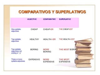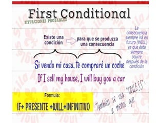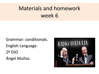 The document provides materials and homework for week 6 on grammar: conditionals. It covers the first conditional (probable/certain), second conditional (improbable), and examples of each. It discusses using the past simple for the conditional part and conditional simple for the result. Examples are given for affirmative, negative, and interrogative sentences. Comparatives and superlatives are reviewed. Students are assigned exercises to complete second conditional sentences and use different conditionals.