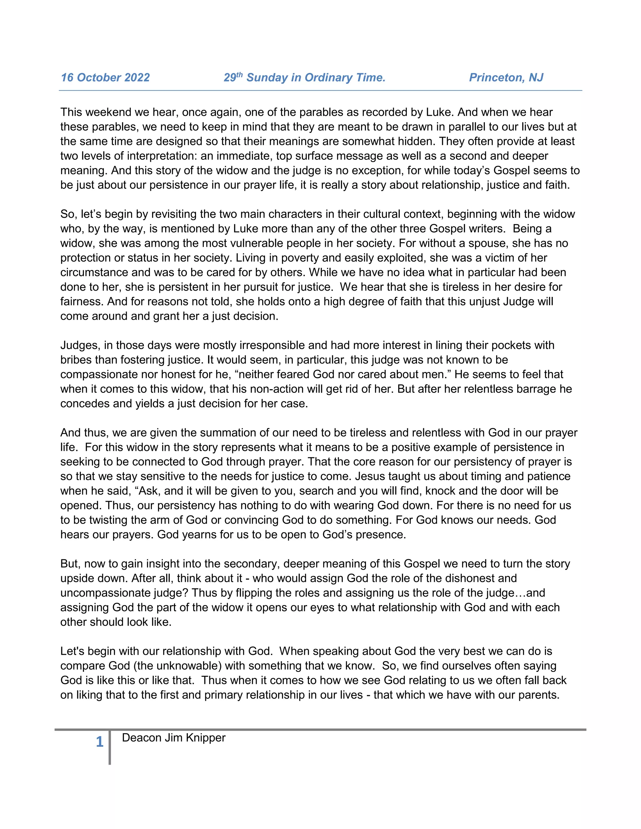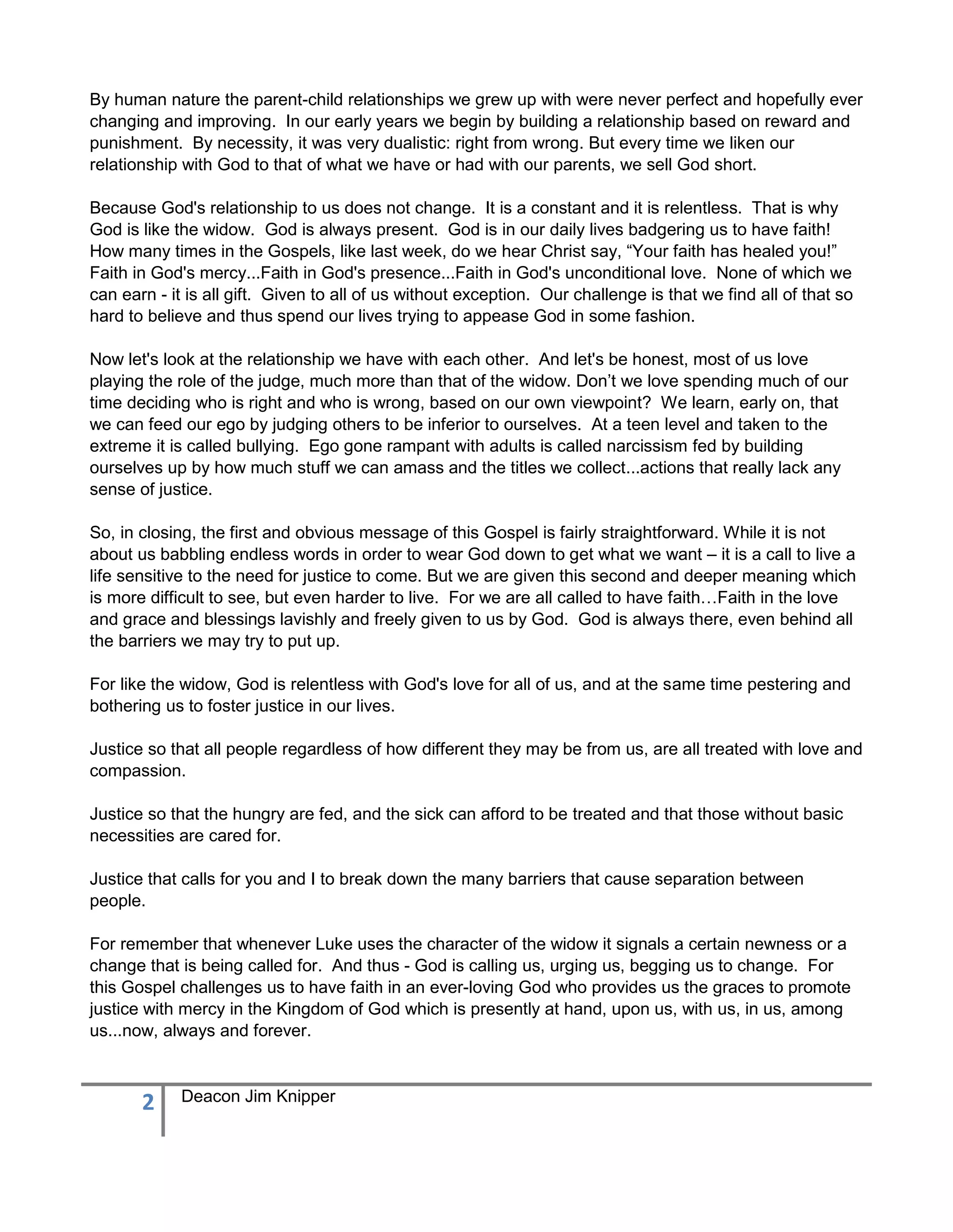 The document explores the parable of the widow and the judge, emphasizing themes of persistence in prayer, justice, and faith. It contrasts the vulnerable widow's relentless pursuit of justice with the judge's indifference, illustrating the importance of maintaining faith in God's presence and compassion. Ultimately, it urges a deeper understanding of the relationship with God and encourages actively pursuing justice and mercy in our lives.