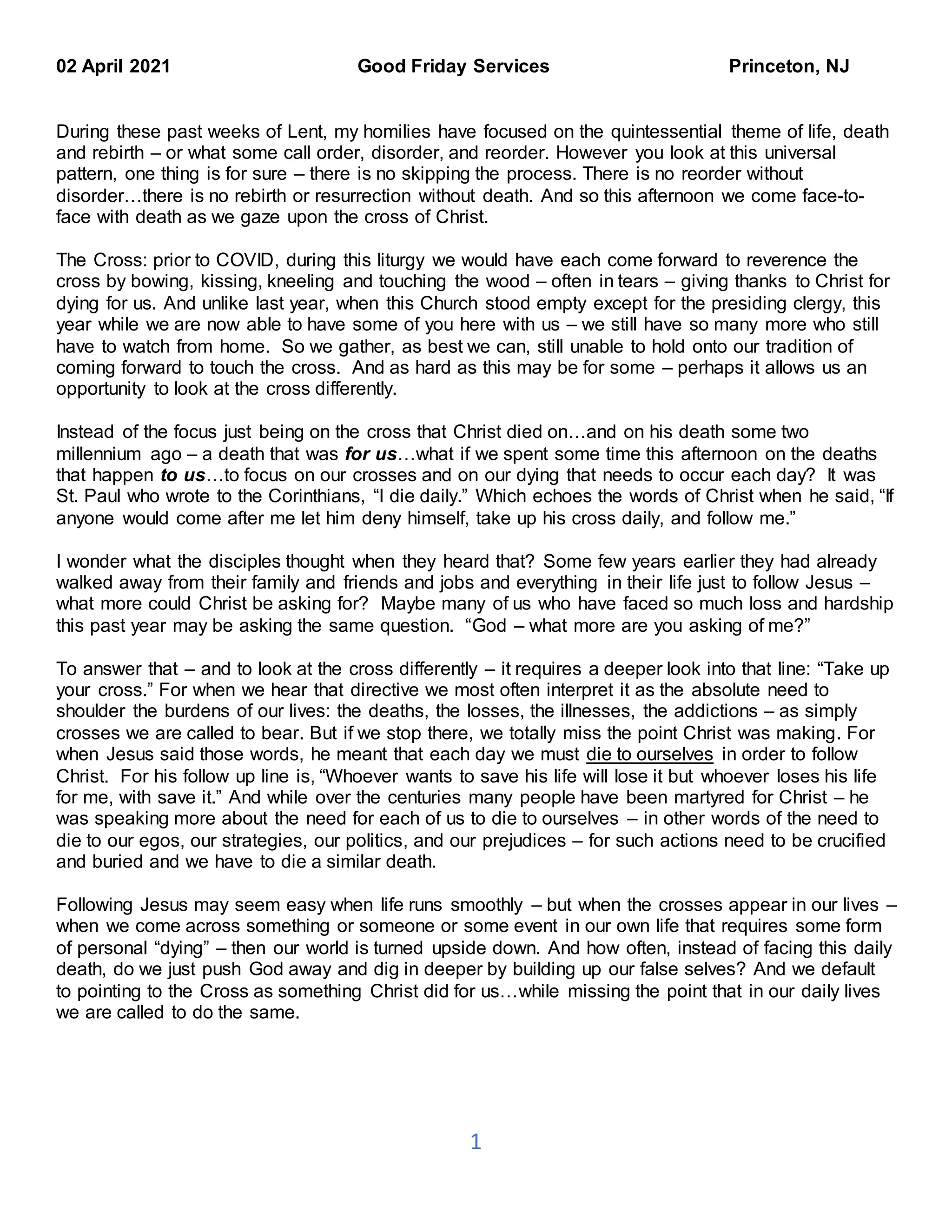 In his Good Friday sermon, the speaker reflects on the themes of life, death, and rebirth, emphasizing that daily personal sacrifices are necessary for following Christ. He invites the congregation to look beyond the traditional reverence of the cross and consider how daily deaths to ego and false selves can lead to deeper understanding and connection with Christ's message. Ultimately, he encourages a transformative approach to facing life's hardships, highlighting that from our crosses may arise hope and consolation.
